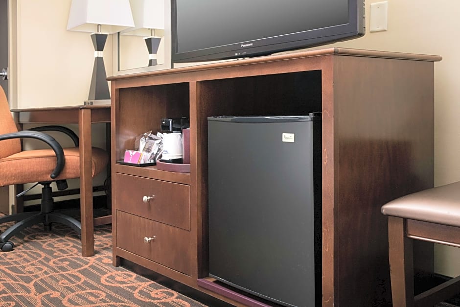 This room has a flat-screen TV, refrigerator, and coffee machine.